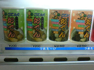 季節感なしのもの 雑記 X Bluesky Misskey はてブ LINE コピー 2005.09.03 残暑厳しい今日この頃。 名古屋大須の第1アメ横ビルの自販機には、季節関係なしにこんなものが売ってます。 「おでん缶」です。 しかも冷えたおでん缶です。 東京の秋葉原にもあるけど、ここでは冷えてます。 食べたい方は是非どうぞ。